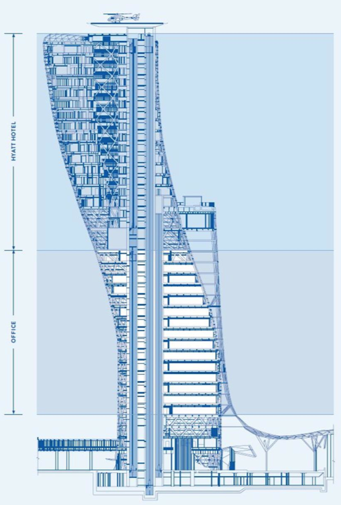 · Il distintivo elemento in acciaio inossidabile che scende dal 19° piano è un elemento di design e un dispositivo di ombreggiamento che elimina più del 30% del calore del sole prima che raggiunga l'edificio. Tale elemento gira anche intorno all'edificio verso sud per proteggere la torre, per quanto possibile, dai raggi solari diretti;